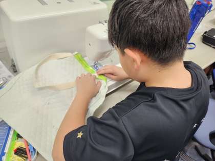 ミシンを使ってトートバッグ作りに挑戦しています。マチをつけたり、持ち手の場所や長さを工夫したりして完成する児童が増えてきました。