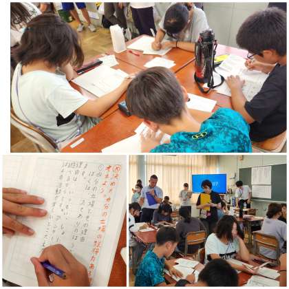校内の研究授業でもあり、たくさんの先生がいる中での学習でしたが、自分たちの学校を盛り上げるためというテーマが子ども達の学習意欲に繋がっているのでしょう、どの子も一生懸命に意見を書き、交流していました。
