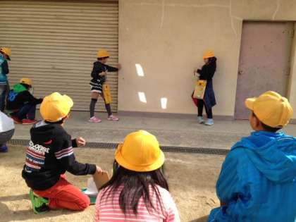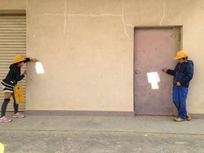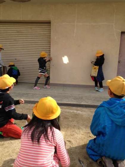 まず1まいの鏡で、はね返した日光を壁に当てて、明るさと温かさを調べました。