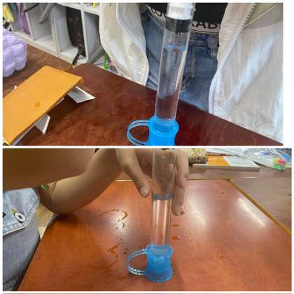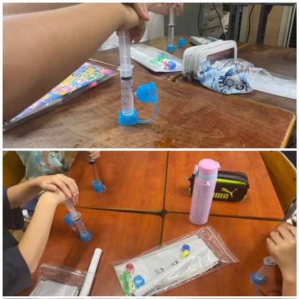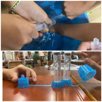今日は、注射器の中に水を閉じ込めて押すとどうなるのか実験しました。