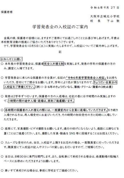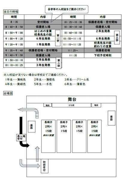 明日は学習発表会を予定しています。9月27日にお配りしている学年の色別の「学習発表会入校証」と上履き・下靴入れを必ずお持ちください。学習発表会に来られる保護者の方は全員、入校証が必要です。お持ちでない場合は、職員室で新たに作成していただく必要があります。