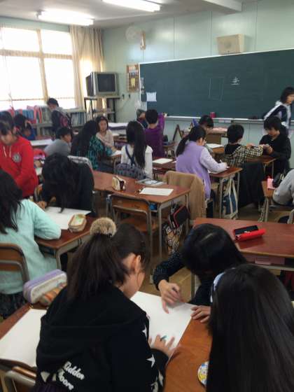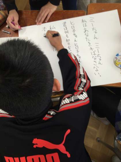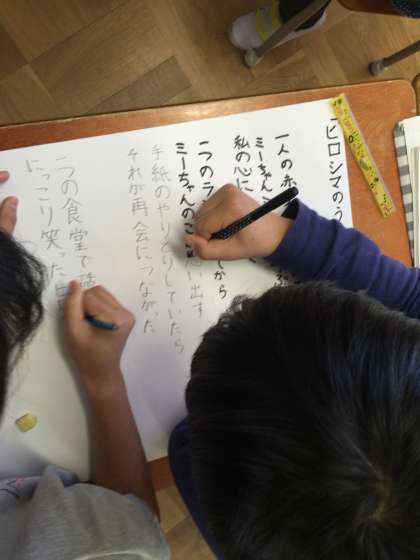 今日は、学習のまとめてとして、「ヒロシマのうたとは何か」、それぞれ班で考えて詩を作りました。