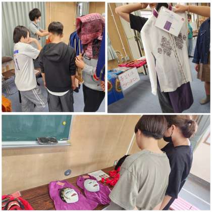 今週は多文化週間です。万博記念公園内の国立民俗博物館から『みんぱっく』としてインドネシアの民族衣装や楽器を借り、校内に展示しています。