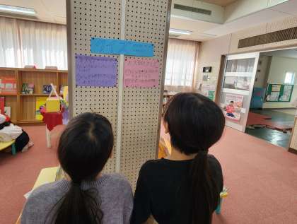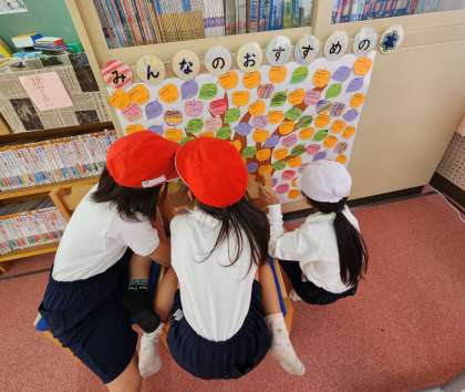 全校児童に書いてもらった『おすすめの本』の掲示物を図書館に貼っています。さっそく低学年が「私が書いたのは…」と探していました。