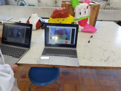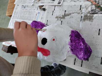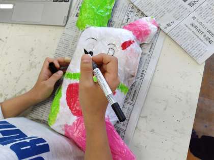 お面の輪郭に半紙を貼り、そこに絵の具で色をつけました。絵の具がかわいたらニスを塗り、ペンで線をはっきりさせて完成です。早くできあがった児童は、お面をつかってKOMAKOMAのアプリで動画を作る活動をしていました。協力してお面に色を塗ったり動画を作成したりと活動を楽しんでいました。