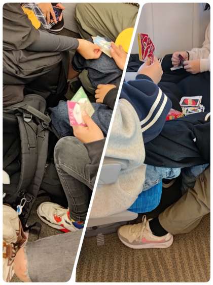 新幹線の中では、カードゲームをしたり、おしゃべりをしたり、マナーを守って楽しんでいます。