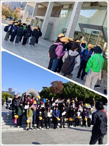 原爆死没者慰霊碑の前で、集合写真を撮りました。