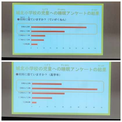 寝不足になると、体の調子が悪くなり元気に学校生活が過ごせなくなることや、城北小学校の児童の睡眠に関するアンケートの結果から分かることなど、「睡眠」に関する大切な話をたくさん発表してくれました。