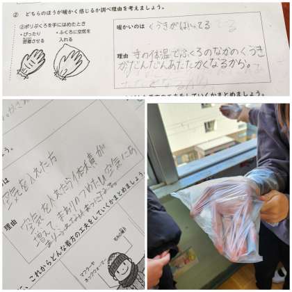 空気の層が出来ることで、体温を逃さず、冷たい外気を遮断できるということを学び、冬に重ね着をしたり、マフラーや手袋をしたりする意味について気づいたようでした。