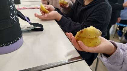 学習園で収穫したおいもをふかしいもにして、おいもパーティーをしました。おいもを食べる前に、どのように育てたのか、どんな風に掘ったのかを思い出して、楽しくおいもをたべました。