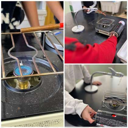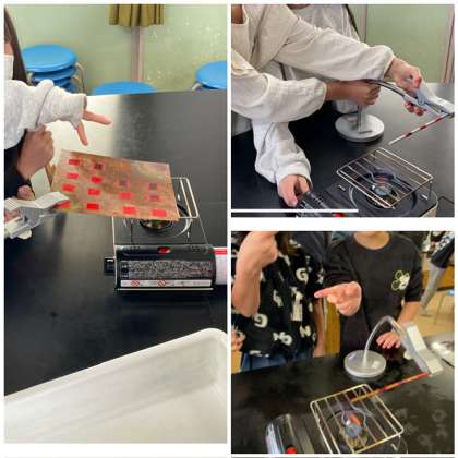 金属の棒や板を温め、どのように温まっていくのかを観察しました。初めは、渦巻状に温まると予想していたグループも実験をしてみると、熱したところに近いところから順に温まるとわかりました。