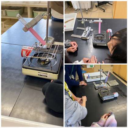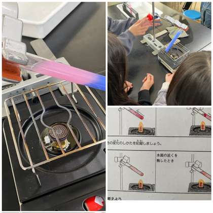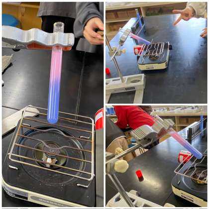 次に試験管の上の方を温めてみると、なかなか下の方までは温まらず、予想とは反する結果になりました。