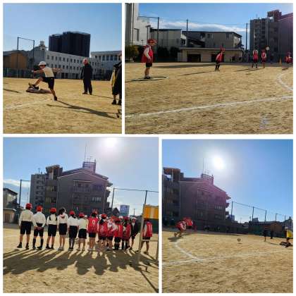 守備と攻撃に分かれて、キックベースボールに取り組んでいます。