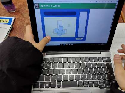 自分たちで方眼紙を使って直方体の展開図をかいて箱を作ったり、タブレットを使って6つの正方形の面を組み合わせて立方体の展開図を考えたり、いろいろ工夫しながら学習しています。