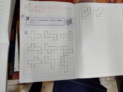 立方体は全部で11種類の展開図があります。どんな展開図ができるか、何度も試していました。「この図でも立方体になるのか。」と感心したり、「もっと考える時間がほしい。」とお願いしたり、友だちと「あともう1つってどんな図?」と話し合ったりと積極的に学習に取り組んでいました。