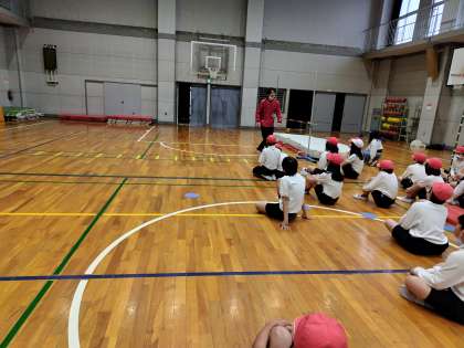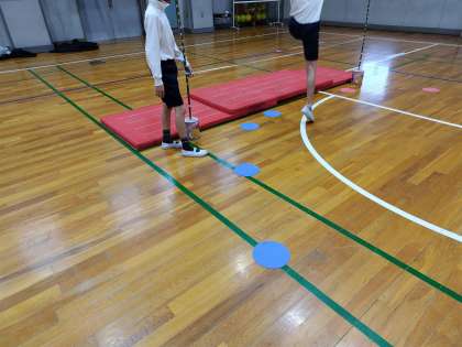 はじめは、歩幅が合わなかったり、バーを蹴り上げてしまったりしていましたが、歩幅の目安となる位置や跳ぶ時の向きを考えることで、少しずつ上手に高く跳べるようになってきました。「100センチメートルが跳べたらすごいよ。」と励まし合いながら練習を続けています。