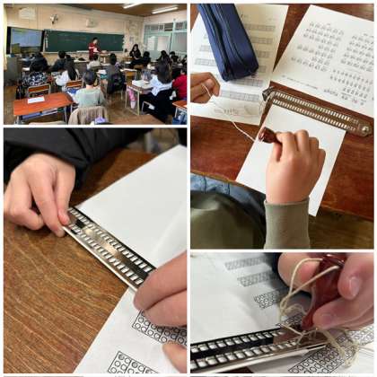 初めて点字器に触れます。6つの点から文字が成り立っていることをしり、「あ」「1」「a」がすべて同じ点で表されることを知り驚いていました。しかし、読む時にわかるように、数符や外字符を打つことでわかりやすくしていることを学びました。