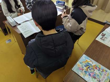 「さくらさくら」は「日本風だな。」、「ソーラン節」は「さくらさくらより音が高くて明るい感じだな。」、「沖永良部の子もり歌」は「沖縄っぽく聴こえる。」など、いろいろな感想をもつことができました。同じ音階を使っていても班ごとに個性が出ていて、おもしろい音楽ができました。1人ずつ吹く人数を増やしたり、最後の音だけ全員で吹いたりするなど、強弱まで工夫することができました。