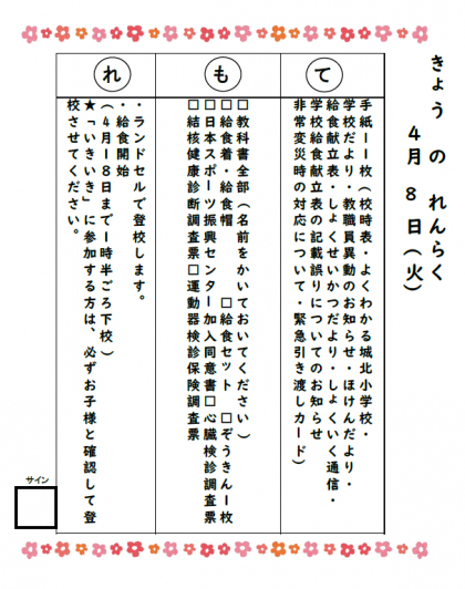 1年生では、ひらがなの学習をするまで、連絡帳を印刷して配付しております。本日、お配りしましたお手紙と一緒に持ち帰っていますので、ご確認お願いします。