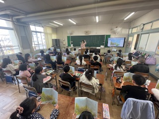 全員で声をそろえて、追いかけ読みや交代読みをしました。写真は、「春の子ども」の音読の様子です。