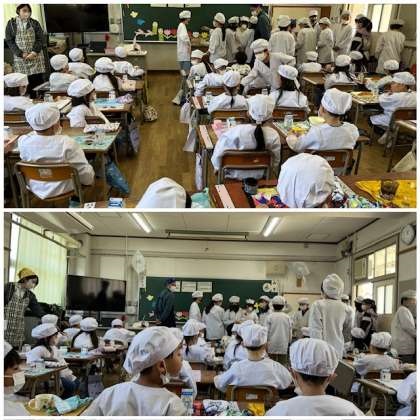 今日から給食が始まりました。しばらく6年生のお兄さんお姉さんが給食のお手伝いをしてくれます。