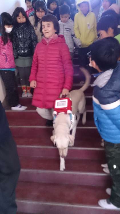 実際に、盲導犬と一緒に階段やろうかを歩く様子を見せていただき、普段の様子のお話を聞きました。