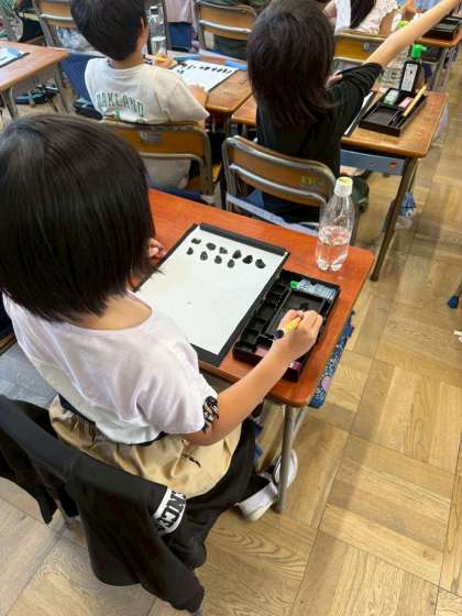 筆を洗う用のペットボトルをまだ持ってきていない場合は、来週までに500ml以下の小さめのものをご準備ください。本体とふたの2ヵ所に記名もお願いします。