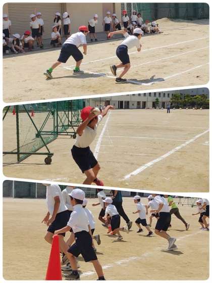 運動場に白線をひき、50m走とソフトボール投げを中心に行っています。計測をしていると、「がんばれー」と力強い応援の声。声援を受けていつも以上にがんばる姿が見られました。