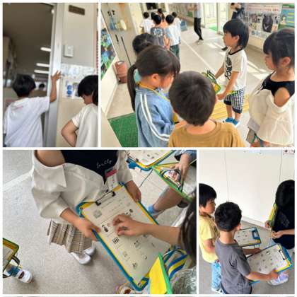 今日は1・2年生で学校探検を行いました。たてわり班のメンバーでまわりました。