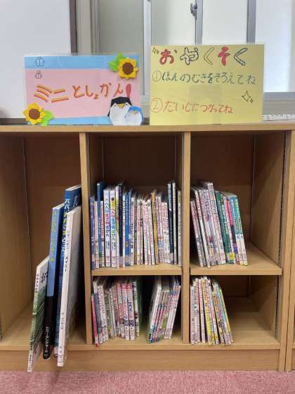 そんな1年生に、安全に落ち着いて絵本を読んでほしいと、教室近くに「ミニ図書館」を開くことにしました。