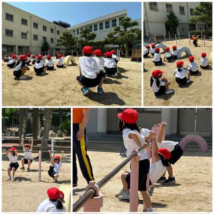 6月から鉄棒の学習が始まりました。ぶら下がって体を支えたり、簡単な回転などを練習しています。