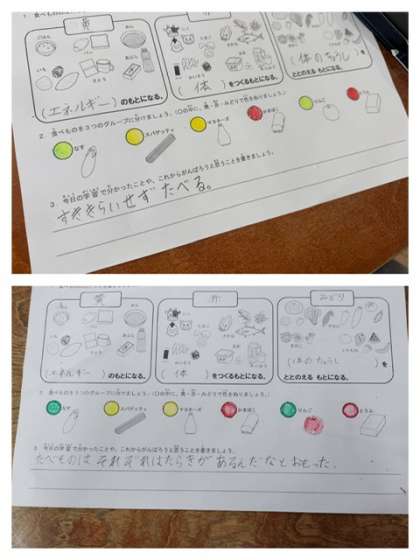 食べ物は働きによって3つのグループに分けられることを知り、き、あか、みどり、バランスよく食べることの大切さを勉強しました。