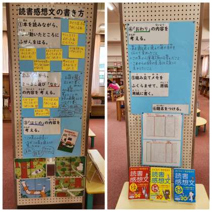そして、夏休みといえば…読書感想文!苦手にしている人も多いかもしれませんね。でも、書き方さえ分かれば、意外とスラスラ書けるものですよ。図書館に、読書感想文の書き方の掲示もありますので、ぜひ参考にしてください。