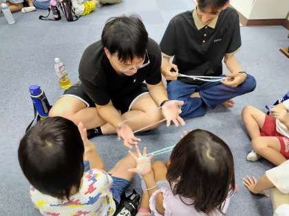 次に、子ども3〜4人に対して2名程度の学生さんについていただき、あやとりで交流しました。どの国にもあやとりの遊びがあり、ネパールでは「ダゴケル」と言うなど、呼び方は違いますが遊び方は一緒でした。最初は緊張していた子どもたちでしたが、時間がたつにつれて、楽しそうにあやとりを教え合う姿が見られました。