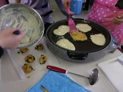 その後は、乳製品を使ったパンケーキなどのお菓子作りを行いました。給食の後でしたが、「とってもおいしい!」とみんな笑顔で食べていました。