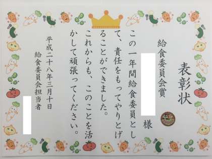 1年間給食委員会の児童が一生懸命頑張ってくれたので、表彰状を一人ずつプレゼントしました。