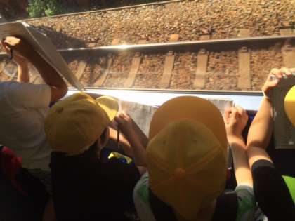 最初に大阪環状線1周して車窓から建物や川などを見つけノートに記入しました。