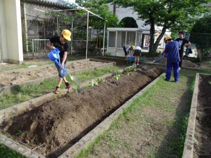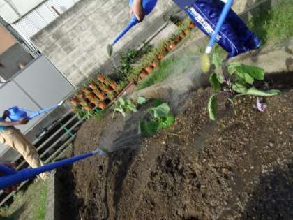 大きくて重いスコップやクワで耕して、その土の中にそっと苗や種を植えて、水をたっぷりあげて・・・。