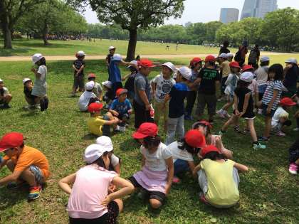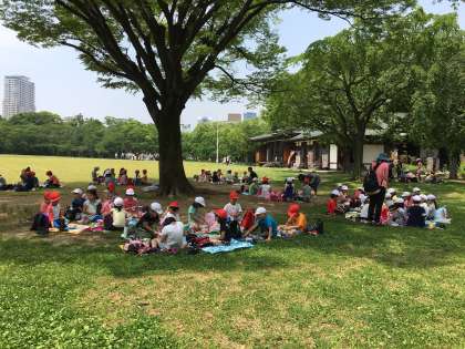 今日は、待ちに待った遠足! 天気予報にはひやひやしましたが、暑いくらいの遠足日和。子どもたちは、小学校で初めての遠足で朝からうきうき!! 2年生のお兄さんお姉さんたちと芝生の上で思いっきり遊んだ後のみんなと食べるお弁当の味は、格別だったようです。