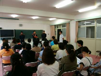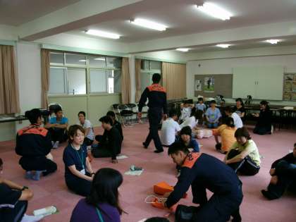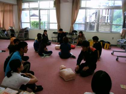 旭消防署の消防士の方に来ていただき、心肺蘇生法(しんぱいそせいほう)とAED(自動体外式除細動器)の使い方を教えていただきました。