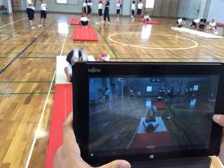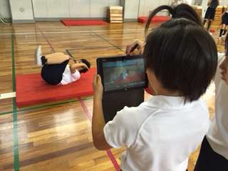 前転・後転・開脚前転・開脚後転をタブレットの動画で撮り、後で再生をして動きのチェックをしました。