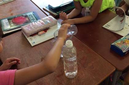 この日は牛乳瓶やペットボトルには何dLの水が入るのかを予想して確かめました。