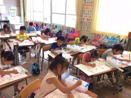 絵の具とパスを使って、ザリガニの絵を描いています。まず、特徴的な大きな爪から描く練習をしました。観察をしながら描くうちに、「爪にブツブツがついてる」「ギザギザして痛そう」とたくさんの気づきがありました。