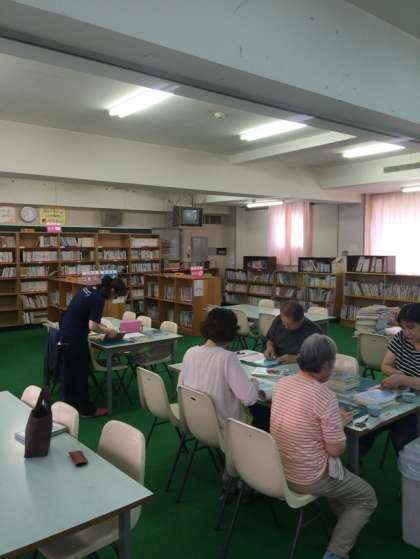 今日は、図書室で定例会を行い、図書の本の修繕等を行っていただきました。