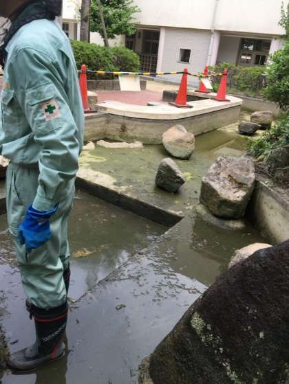 池の底の方に泥が残っていたので、協力して取り出しました。