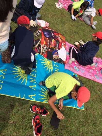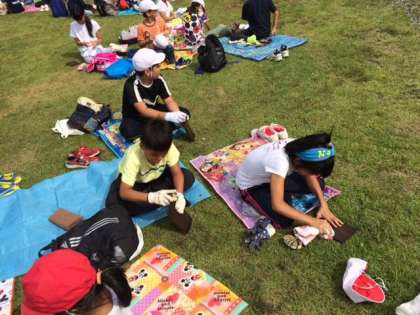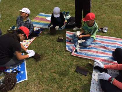 職員の方に作り方を聞き、みんなで板を磨いています。