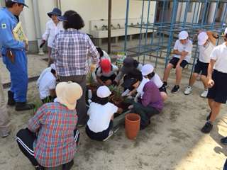 1人1本の花菖蒲を植木鉢に植え替え、城北小の学習園に設置しました。