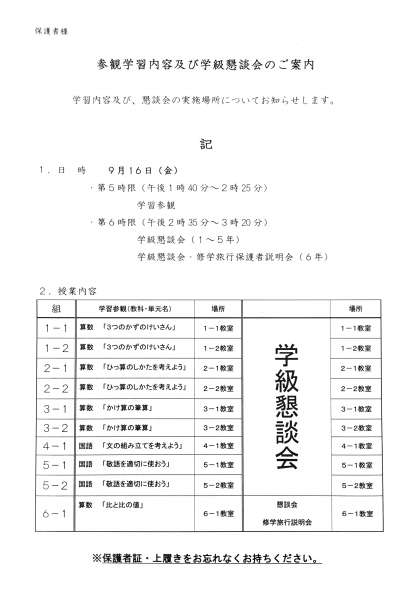 今週金曜日に、参観学習、学級懇談会、6年修学旅行説明会があります。