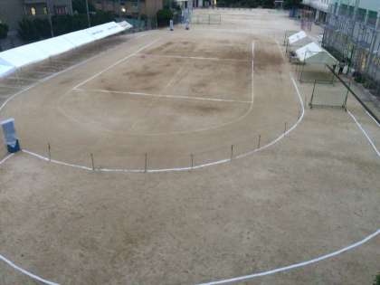写真の中の入(退)場門と緑色のフェンスの間が、保護者席となります。