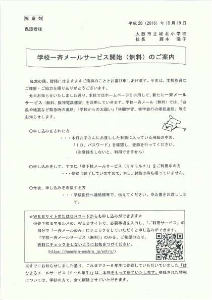 学校一斉メール(無料)開始のお知らせ 10月19日(水)